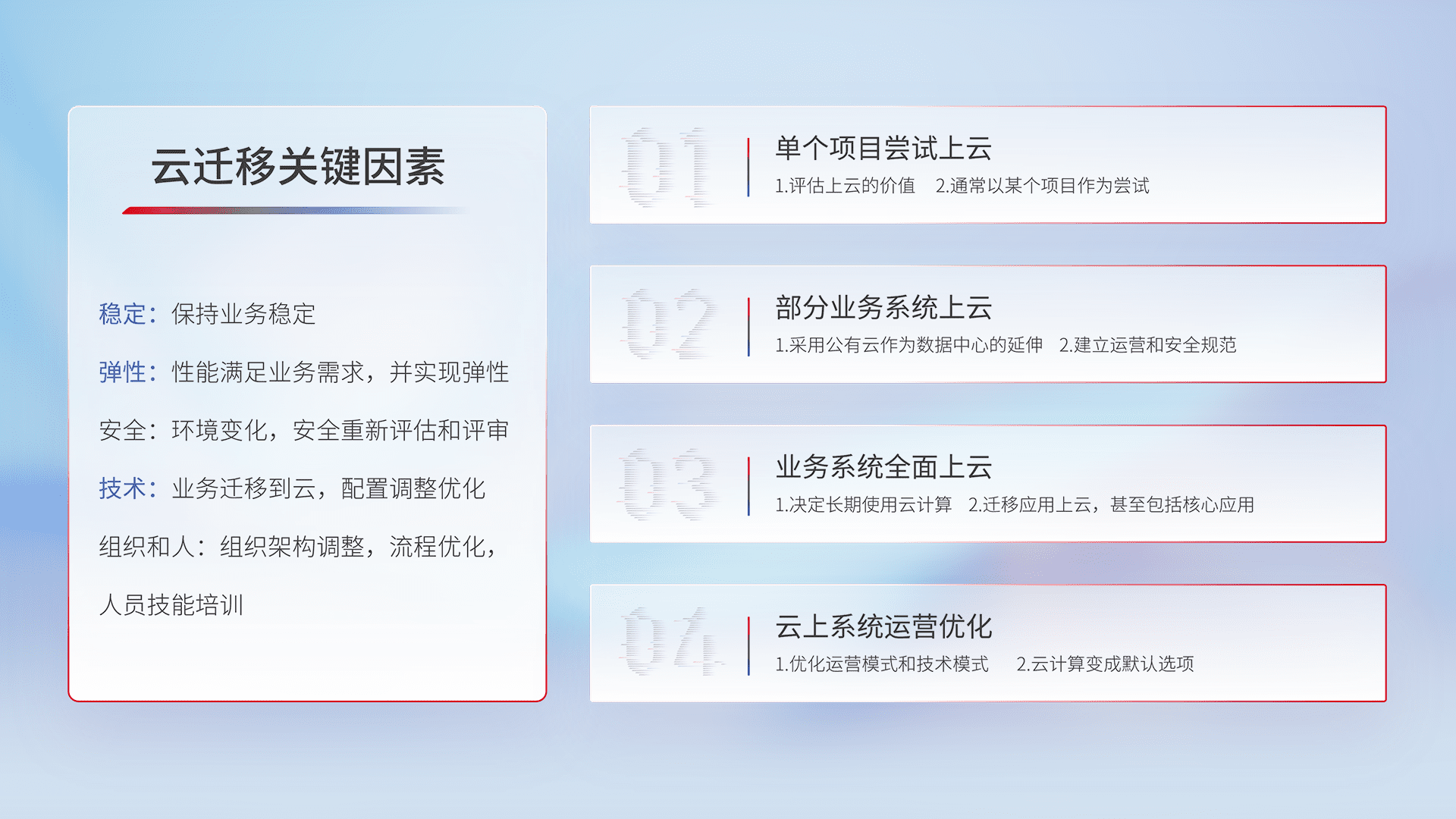 结合实际业务,,,从规划设计、、、、云平台选型、、云原生改造、、、、数据迁移、、集成交付,,迁移全过程为客户识别最佳上云路径,,,做好风险识别管理,,,,设计网络架构、、身份权限、、、安全审计合规、、操作审计、、日志审计、、监控告警策略、、、多站点容灾设计等,,,,对云上基础设施进行整体规划,,,提升IT治理水平,,,,以满足弹性、、高可用、、高性能的需求。。。。