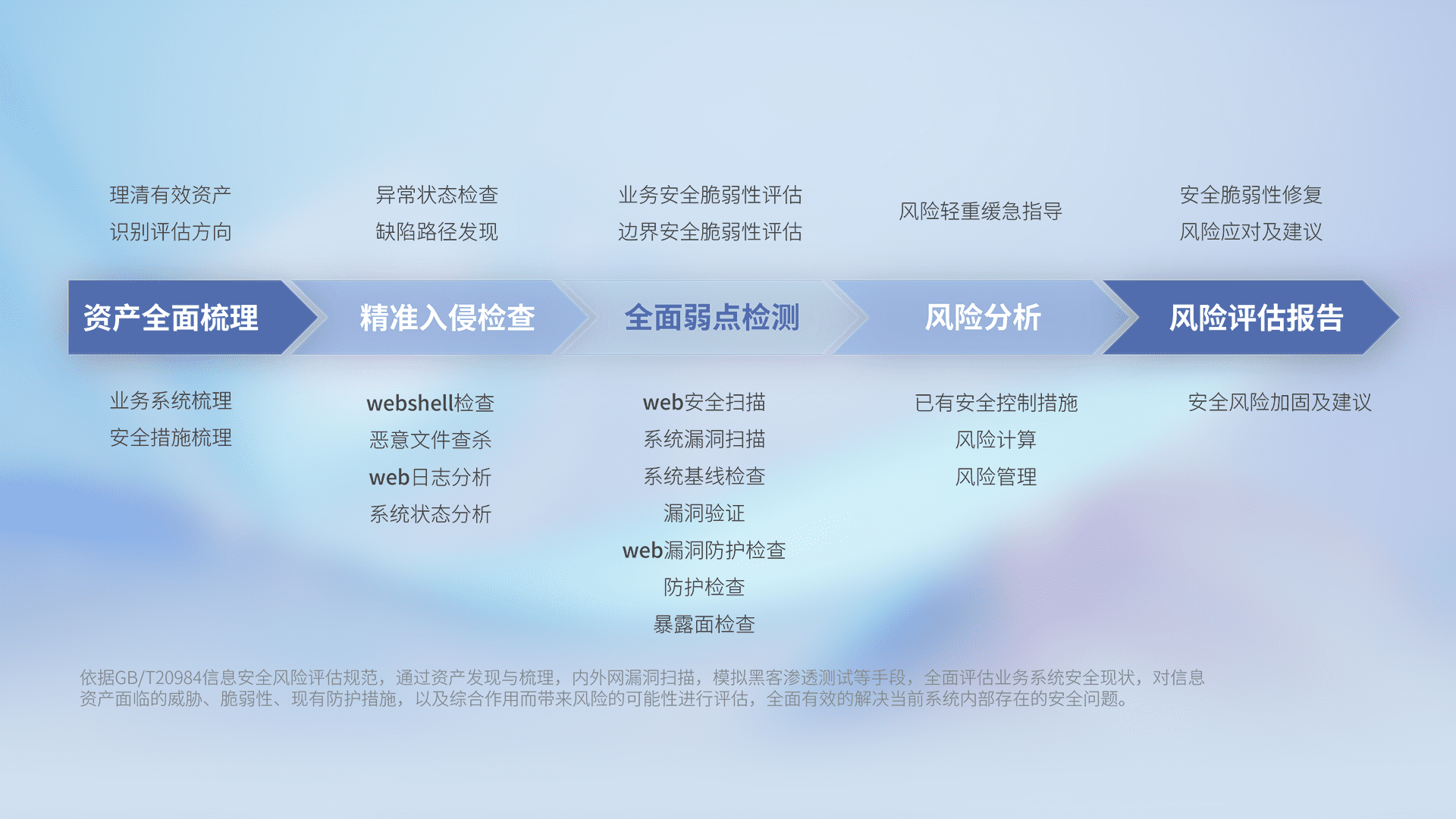 针对客户行业特性,,,,以专业的安全服务+多厂商联合解决方案提供专属的一站式安全管理服务,,,,帮助客户全面感知网络空间威胁,,基于识别、、检测、、分析、、、防护、、、、监测、、响应的服务理论模型,,从方案咨询、、集成交付、、、、评估验证、、、优化加固、、、、运维运营,,致力于为客户提供完整的闭环管理式安全服务。。。。以实战经验为客户打造高抵御风险的安全体系,,,帮助客户发现威胁、、对抗威胁、、、、处置威胁,,,,不断积累安全对抗能力,,持续保障数字化安全。。。
